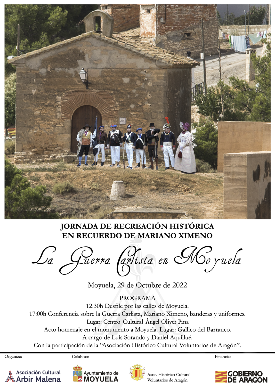 Con el objetivo de divulgar la historia del siglo XIX en Aragón y, en concreto, en Moyuela, se lleva a cabo esta jornada histórica centrada en la Primera Guerra Carlista (1833-1840) en tierras aragonesas y en Mariano Jimeno, nacido y vecino de Moyuela y cabecilla carlista.